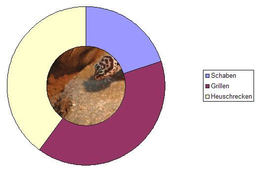 Ein gutes Hauptfutter sind sämtliche Grillenarten, die im Handel zu bekommen sind, z.B. Mittelmeer- und Steppengrillen und vor allem die Heimchen. Sie sind günstig, einfach zu halten und lassen sich gut verfüttern. Ein bisschen aufpassen muß man allerdings, daß keine Grillen aus dem Behälter oder dem Terrarium entwischen, denn sie können einen mit ihrem Gezirpe echt zum Wahnsinn treiben. Wenn sie sich irgendwo in einem Hohlraum (z.B. Türrahmen) versteckt haben, hat man keine Chance.... Es werden auch oft verschiedene Heuschreckenarten angeboten, z.B. die Afrikanische Wanderheuschrecke, die für Lärmempfindliche eine gute Alternative darstellt. Allerdings sollte man schon auf Abwechslung achten und nicht nur Heuschrecken füttern. Sie sind sehr proteinreich und zuviel davon macht die Leopardgeckos fett. Auch Schaben werden von Leopardgeckos gerne gefressen, z.B. die bei meinen Leos beliebte „Schoko-Schabe“ (Shelfordella tartara).