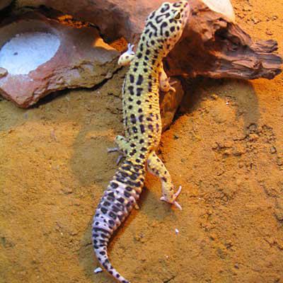 Hier ein Beispiel von einem gut genährten Leopardgecko, der nur zweimal in der Woche Futter bekommen sollte (im Hintergrund seht ihr übrigens ein Schälchen mit geriebener Sepiaschale):