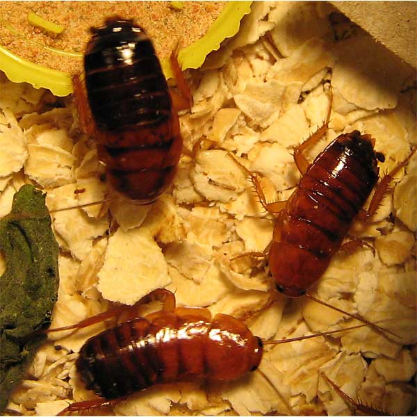 Es gibt nichts Schöneres für meine vier Fressmaschinen, als „Schabenjagen! Dieses Vergnügen gönne ich ihnen allerdings meistens nur, wenn sie vorübergehend im Quarantäneterrarium einquartiert sind (z.B. bei einer Wurmkur), denn dort können sich die Schaben nicht besonders gut verstecken. Ansonsten biete ich die Schaben in einem tiefen Futternapf an, der innen glatt ist, damit sie nicht herauskrabbeln können.